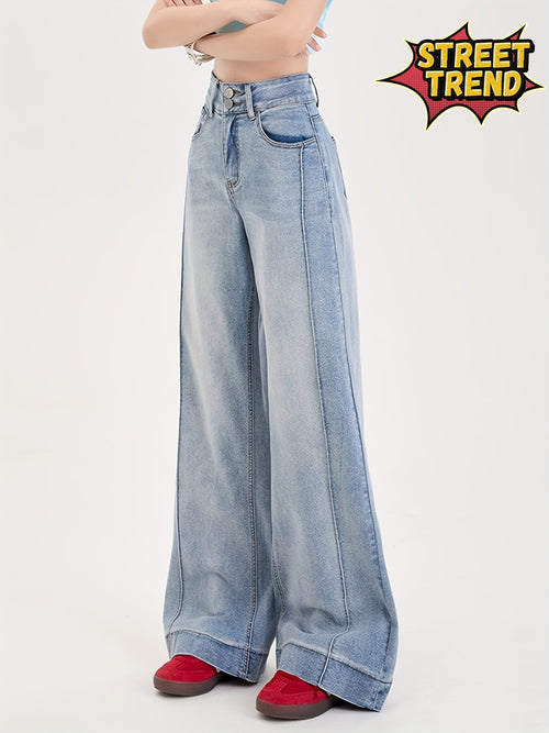 Women's Retro High-Waisted Wide-Leg Jeans - Tummy Control, Drop Crotch, Loose Fit for Pear-Shaped Silhouette, Solid Color Autumn Casual Pants -