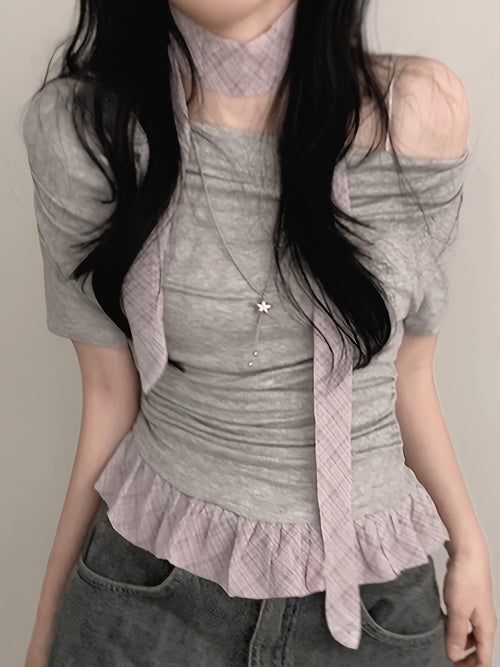 SassyGals Women's French-Inspired Elegant Ruffled Sleeve & Faux Peplum Hem T-Shirt - Light Blue Grid Pattern, Stretchy Polyester\u002FElastane Blend, Waist-Cinching Top for Summer Casual & Semi-Formal Outfits -